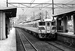 ![]() '75-3-19 山中渓 キハ82系 15D くろしお4号 (当時のカラー画像は下記をご覧下さい) "国鉄・阪和線・想い出のカラー |